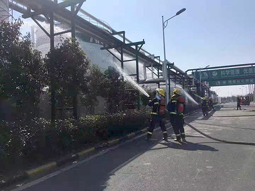 在滅火演習中,基地員工按照應急預案正確佩戴防護措施,快速反應,在規定時間內趕到模擬起火地點,完成撲救;消防水演習中,在員工發現起火后,通知全員進入應急狀態,兩分鐘內在距起火地點最近的兩處消防栓接出消防水帶并順利出水,完成設備降溫及滅火工作。