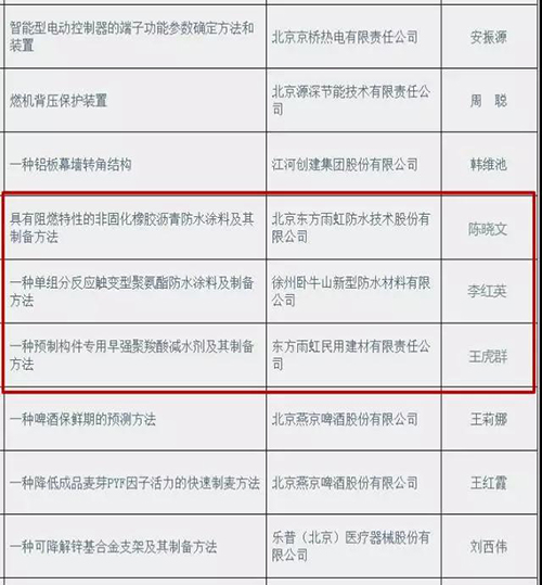 其中北京東方雨虹防水技術股份有限公司段文鋒工作室的“特種非固化橡膠瀝青防水涂料”獲得創新項目助推;北京東方雨虹防水技術有限公司的“具有阻燃特性的非固化橡膠瀝青防水涂料及其制備方法”、東方雨虹民用建材有限責任公司的“一種預制構件專用早強聚羧酸減水劑及其制備方法”、徐州臥牛山新型防水材料有限公司的“一種單組分反應觸變型聚氨酯防水涂料”獲得創新發明專利助推。