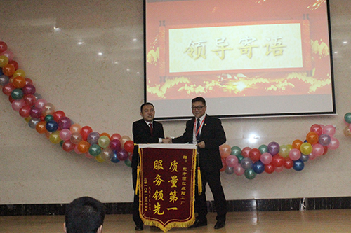 接著,楊海明先生發(fā)表講話,他對(duì)生產(chǎn)基地今年取得的成績(jī)表示熱烈的祝賀,并感謝咸陽生產(chǎn)基地2017年在產(chǎn)品、服務(wù)、物流方面提供的協(xié)助。張程先生也對(duì)咸陽生產(chǎn)基地一如既往地提供支持表示衷心感謝,并贈(zèng)送致謝的錦旗。