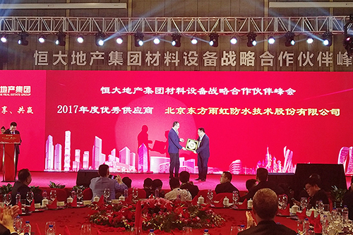 1月4日,由恒大地產(chǎn)集團舉辦的2017年恒大地產(chǎn)集團材料設(shè)備戰(zhàn)略合作伙伴峰會在深圳市南山區(qū)希爾頓酒店舉行。會上恒大對2017年作出重要貢獻(xiàn)的戰(zhàn)略合作企業(yè)進(jìn)行表彰,東方雨虹獲評“2017年度優(yōu)秀供應(yīng)商”榮譽稱號, 廣東東方雨虹董事長兼總經(jīng)理楊浩成出席活動并領(lǐng)獎。