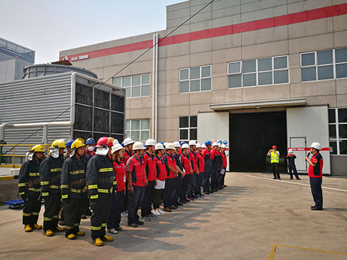 28日下午14時50分,隨著瀝青卷材環保裝置火災警報突然響起,唐山生產基地立即啟動火災撲救及應急疏散預案。應急小組迅速就位,全體員工有序撤離;唐山市豐南區消防大隊官兵接到報警電話后抵達現場開展滅火救援,消防演習取得圓滿成功。