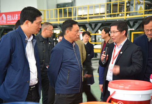 岳陽東方雨虹廠長向鋒帶領考察組參觀了生產基地水性涂料車間和高分子卷材車間,詳細匯報了東方雨虹及岳陽生產基地的總體經營情況,并講解了公司主要產品的生產工藝、產品優勢及重大工程應用情況。