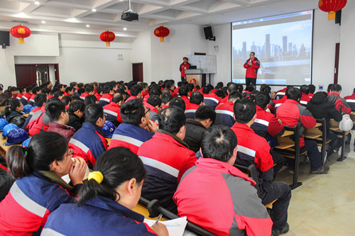 早上七點(diǎn),唐山生產(chǎn)基地廠長馬到原在辦公樓前迎接所有員工,給大家拜年并發(fā)放開年紅包。八點(diǎn),全體員工集合,進(jìn)行農(nóng)歷新年第一次升旗儀式,由馬到原和各部門主管級以上人員簽訂2017年度安全責(zé)任狀,組織全體員工進(jìn)行安全宣誓,隨后,全體人員進(jìn)行了2個(gè)小時(shí)的安全培訓(xùn)。