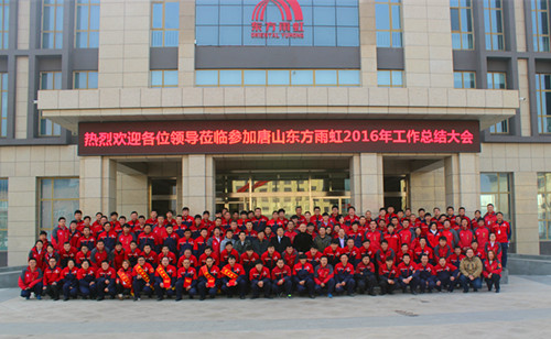 1月11日, 唐山東方雨虹2016年年終總結暨2017年工作部署大會召開,公司管理層及職工代表共180余人參會。東方雨虹副總裁陳永初,生產運營中心副總監、唐山東方雨虹廠長馬到原,生產運營中心總監助理朱方強,建設開發中心建設副總指揮曲巖峰,中潤濱海建設集團有限公司總經理祝海斌等出席會議。