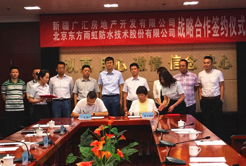 8月3日,新疆廣匯房地產(chǎn)開(kāi)發(fā)有限公司與東方雨虹在廣匯集團(tuán)總部簽訂戰(zhàn)略合作協(xié)議。廣匯實(shí)業(yè)集團(tuán)董事、房產(chǎn)置業(yè)總經(jīng)理?xiàng)铊F軍,實(shí)業(yè)集團(tuán)董事局秘書李文強(qiáng),房產(chǎn)置業(yè)集團(tuán)總工程師王斌,開(kāi)發(fā)公司副總經(jīng)理熊煒,招采中心主任賈建軍,人力資源行政部部長(zhǎng)申強(qiáng);東方雨虹防水集團(tuán)副總裁張志萍,工程渠道事業(yè)部西北區(qū)總經(jīng)理?xiàng)詈C鳎こ糖朗聵I(yè)部新疆區(qū)域總經(jīng)理路曉征,工程渠道事業(yè)部新疆區(qū)域經(jīng)理李曉璐等出席簽約儀式。
