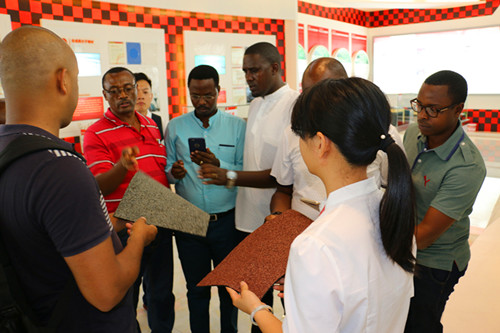 在惠州生產(chǎn)基地相關(guān)人員的引領(lǐng)下,考察團(tuán)參觀了東方雨虹惠州生產(chǎn)基地改性瀝青卷材、防水涂料生產(chǎn)車間和模型展廳。馬里奧向考察團(tuán)一行介紹了東方雨虹的發(fā)展歷史和企業(yè)文化,提到東方雨虹是一家集研發(fā)、生產(chǎn)、銷售和施工于一體的防水系統(tǒng)服務(wù)商,近年來為非洲各國(guó)大型基礎(chǔ)設(shè)施提供了優(yōu)質(zhì)的防水材料和專業(yè)的技術(shù)支持,并為當(dāng)?shù)嘏囵B(yǎng)了一批標(biāo)準(zhǔn)化施工工人,這些都得到了客戶的認(rèn)可和當(dāng)?shù)卣闹С郑蔀楹芏嗫蛻舻暮献骰锇椤⒂^后,考察團(tuán)對(duì)基地的生產(chǎn)能力及產(chǎn)品質(zhì)量給予了極高地評(píng)價(jià),并有兩家建筑商當(dāng)場(chǎng)與東方雨虹簽訂了海外代理合作協(xié)議,還表示要將本次在東方雨虹的考察結(jié)果帶到本地去推廣。