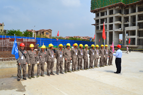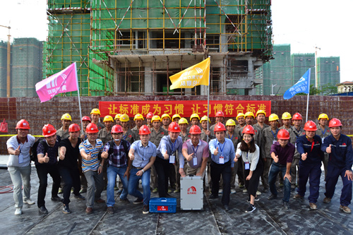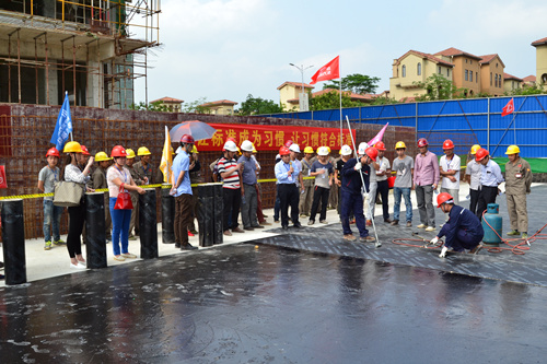 為提高防水工程施工質(zhì)量和施工現(xiàn)場管理水平,解決因施工粗放而導致建筑滲漏率居高不下的問題,切實打造優(yōu)質(zhì)防水工程,東方雨虹決心在全國推行防水標準化施工服務體系。4月25日,東方雨虹工程渠道事業(yè)部與南寧東方雨虹防水工程有限公司共同組織舉辦了防水示范工地觀摩交流活動----東方雨虹嘉和城白鷺郡南山項目防水標準化施工推介會。 嘉和城項目施工現(xiàn)場警戒線、標示牌、司旗等一應俱全,工人們統(tǒng)一著裝,以良好的風貌列隊進場,嚴格執(zhí)行標準化施工的要求。