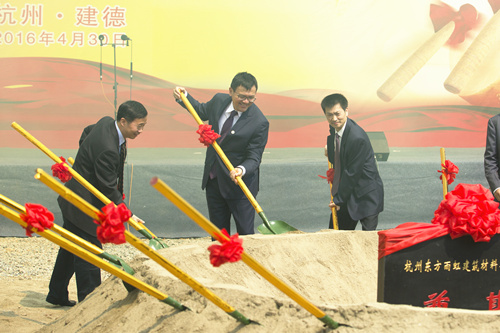 2016年4月30日9點18分,伴隨著絢麗的彩煙騰空而起,東方雨虹建德生產研發基地開工儀式在杭州建德市隆重舉行。建德市委書記戴建平、市長童定干、市人大主任程茂紅、市政協主席吳鐵民等市領導,建德高新園管委會領導及市級相關部門領導,東方雨虹董事長李衛國,建設開發中心總監吳士慧,工渠華東片區總經理馬秉珠及部分員工等近百人出席了開工儀式。