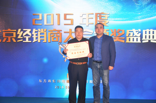 東方雨虹民建公司總經理熊俊先生首先發表致辭,他表示建材行業正在進行新一輪的洗牌,三無產品、小品牌將被淘汰出局。2016年,東方雨虹將繼續發揮品牌優勢,用專業和規范引領行業發展,砥礪前行,營造新的市場局面。 會議安排2015年度北京優秀經銷商表彰環節,設置突出貢獻獎、10年忠誠客戶獎、優秀合作獎等7個獎項, 有20余位經銷商獲獎。