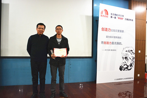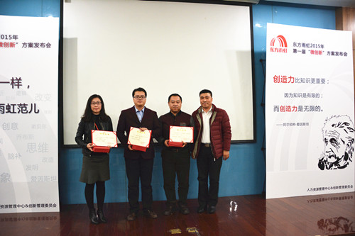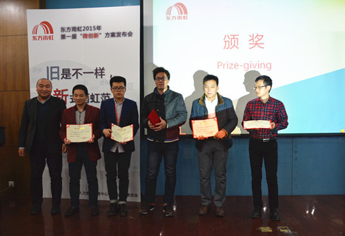 2015年12月16日,東方雨虹2015年第一屆“微創新”方案發布會順利召開。來自生產運營中心、民用建材分公司、信息部等各系統、各部門共計9支優秀代表隊參加,東方雨虹總裁向錦明先生出席本次發布會。 現場評審團由8名創新委員會委員、50名大眾評審組成,通過使用“雨虹幣”投票累計幣值的方式產生本屆“微創新”方案比賽的最終結果。來自生產運營中心的竇登裕憑借《預浸油溫控系統改進》方案的優良效果,獲得現場很高支持率,榮獲“創新達人”稱號;技術保障分中心、應用技術中心、信息管理中心、民用建材分公司以及北京公司各代表隊依次斬獲二至九名。