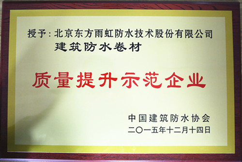 12月14日,中國建筑防水協(xié)會(huì)第七次會(huì)員大會(huì)暨“全國建筑防水行業(yè)質(zhì)量提升大會(huì)”在京舉行。北京東方雨虹防水技術(shù)股份有限公司在會(huì)上被評(píng)為“質(zhì)量提升示范企業(yè)”。 2015年9月,在國家質(zhì)檢總局的指導(dǎo)下,由中國建筑防水協(xié)會(huì)聯(lián)合地方防水社團(tuán)組織及骨干企業(yè)開展的建筑防水行業(yè)“質(zhì)量提升萬里行”活動(dòng)啟動(dòng),東方雨虹作為“建筑防水行業(yè)質(zhì)量萬里行”典型單位,在會(huì)上被授予“質(zhì)量提升示范企業(yè)”稱號(hào)。