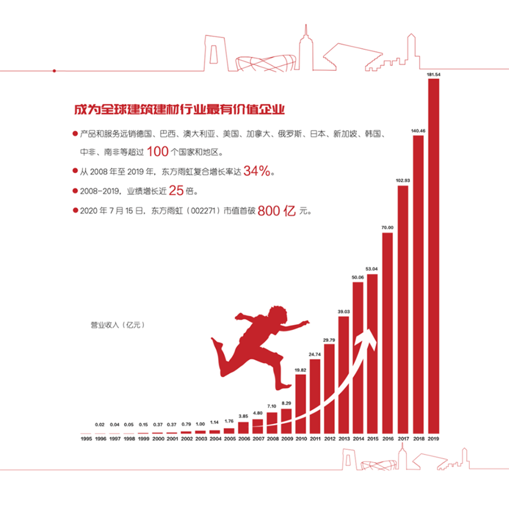 據悉,該榜單由《財富》(中文版)與中金公司財富管理部合作編制,以2019年財務年度的營業收入為標準,覆蓋范圍包括在中國境內外上市的所有中國公司。2019年,東方雨虹(ORIENTAL YUHONG)營業收入181億元,自2008年上市至2019年,公司復合增長率達34%,業績增長近25倍,步履不停,節節攀升。