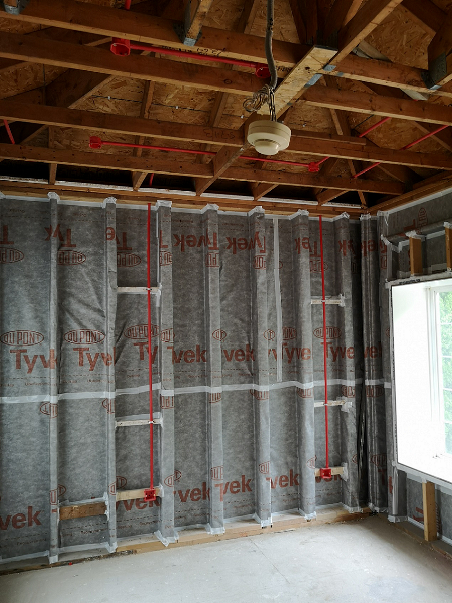 特衛強®防水透汽膜可防止外部雨、雪、昆蟲等對建筑的侵蝕,杜絕了濕氣的來源,另外其獨特的透水蒸氣性能,又能讓建筑墻體中的濕氣排出,避免潮氣在建筑墻體中的滯留。防水透汽膜一般用于建筑墻體靠外一側,本項目翻新時先做防水透汽膜的施工,施工工藝為空鋪,由墻角從下往上施工,采用木工釘或氣釘間隔300~600mm加以固定,并配合配套膠帶對拼接縫進行密封,干作業施工便捷,縮短維修工期。在建筑翻新過程中無需拆除建筑外墻裝飾,室內作業不受環境影響,施工干擾性小。